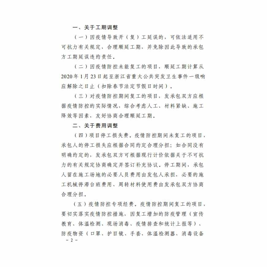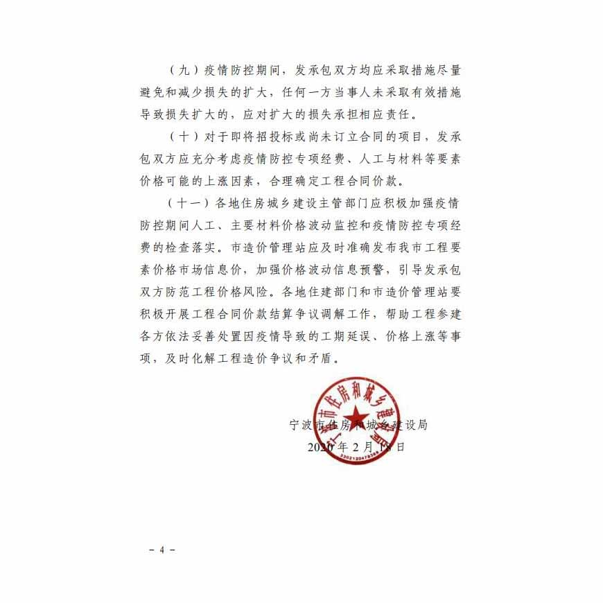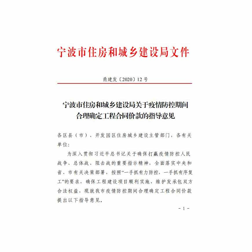 甬建发〔2020〕12号宁波市住房和城乡建设局关于疫情防控期间合理确定工程合同价款的指导意见