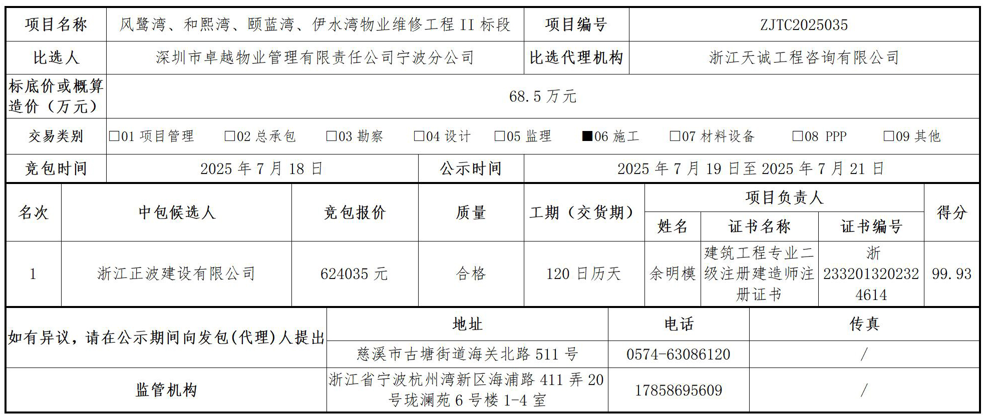 风鹭湾、和熙湾、颐蓝湾、伊水湾物业维修工程II标段中包候选人公示