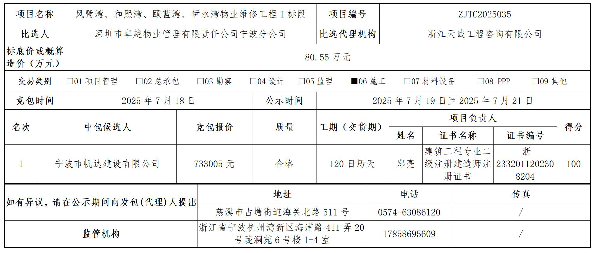 风鹭湾、和熙湾、颐蓝湾、伊水湾物业维修工程I标段中包候选人公示