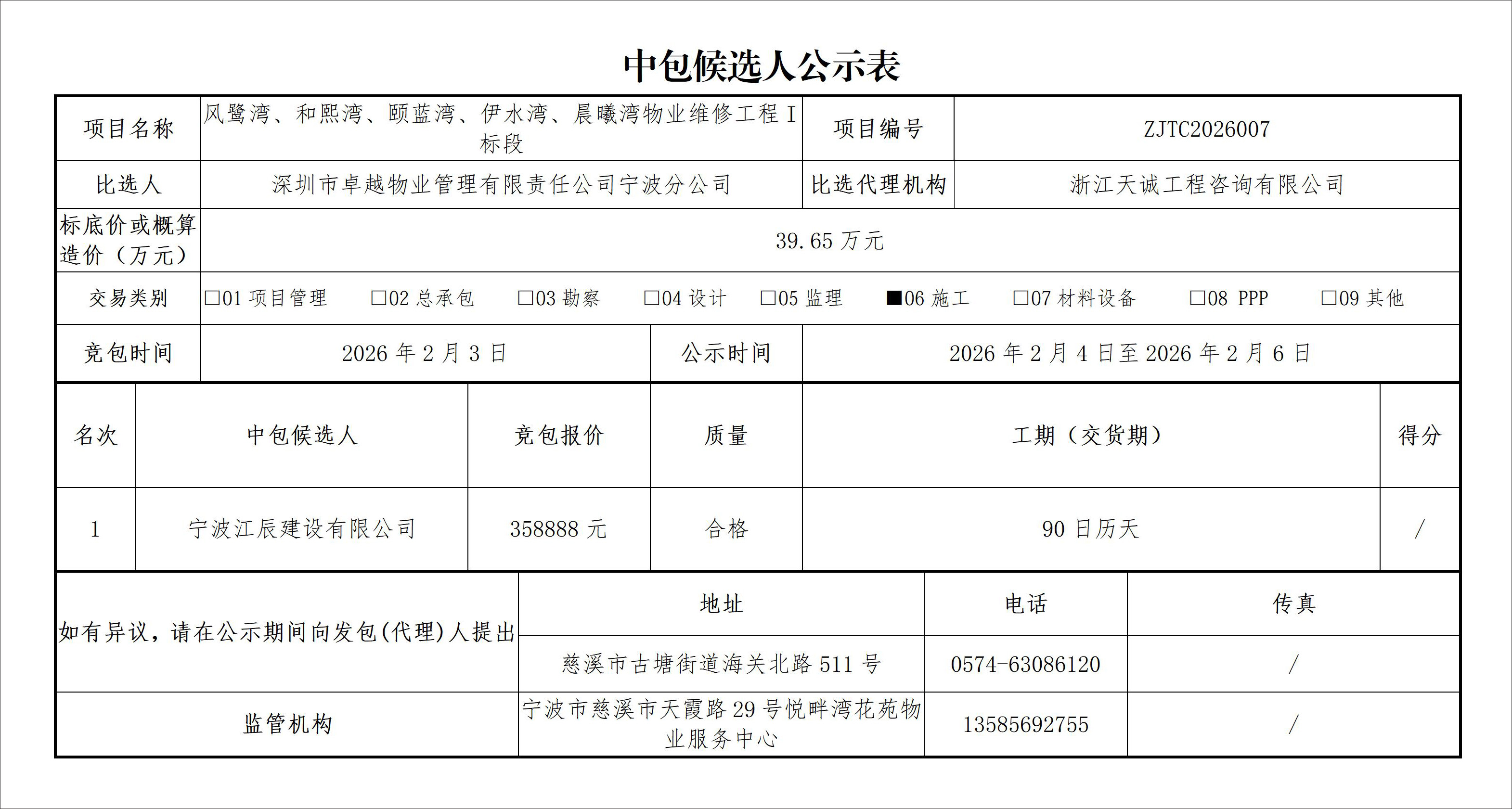 风鹭湾、和熙湾、颐蓝湾、伊水湾、晨曦湾物业维修工程I标段中包候选人公示
